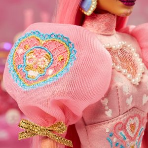 Barbie unites with Paola Wong of Pink Magnolia México for a Día de Muertos collaboration that celebrates the festive holiday and both brands’ iconic color. Barbie doll dazzles in a two-tiered tulle gown embroidered with heart and sugar skull details. A floral headpiece featuring golden leaves lends the crowning touch. During this time of honoring family and friends. let the love be with you.