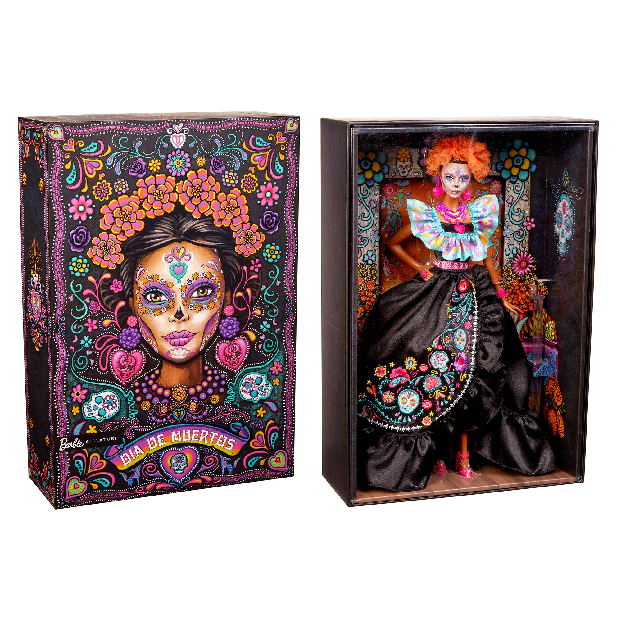 Barbie doll looks luminous wearing a long. black ruffled gown with intricate. colorful detailing and embroidered sugar skulls. Her orange headband highlights her updo and evokes the festival’s iconic marigold flowers. Calavera face paint and bright pink accessories complete her festive look. While sold separately. both Barbie and Ken dolls wear complimentary patterns. making them a perfect set and the ultimate keepsake that inspires joy and elegance.