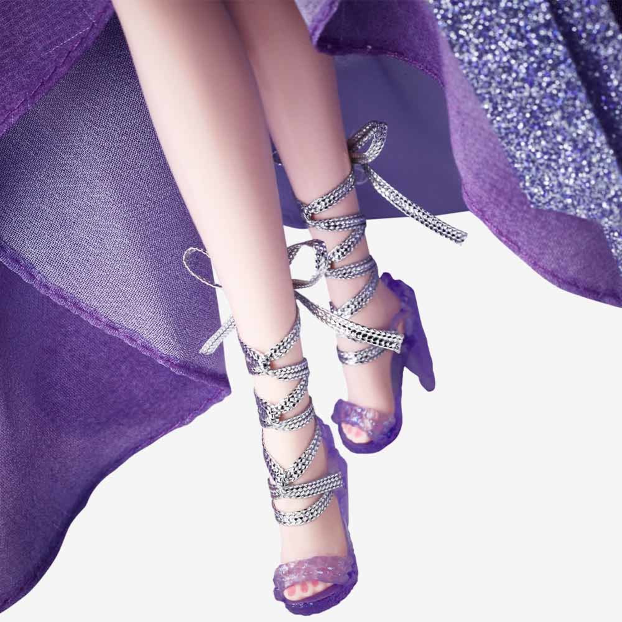 The Barbie Crystal Fantasy Collection is designed to reflect the unique energy and beauty of exceptional stones. Widely regarded for its spiritual and healing properties. the amethyst stone comes to life with Barbie® doll dressed in a sweeping lavender chiffon gown with a glittering sash delicately tied at the waist. She emits pure energy with a genuine amethyst stone necklace. fragmented crystal-inspired bracelets and enchanting makeup. A crown resembling gathered shards of amethyst adorns her upswept. platinum ponytail with soft lavender highlights. Reminiscent of splintered amethyst. crystalline heels with metallic laces wind up her legs as she stands in spellbinding luminosity. The packaging. featuring amethyst-inspired details and a glowing light feature. makes for a truly captivating display. Includes doll stand and Certificate of Authenticity. Doll cannot stand alone. Colors and decorations may vary.
