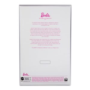 Chic and alluring. the fourth addition to the members-only Barbie Fashion Model Collection is a vintage-inspired vision. Her timeless yet unique look features a full cage crinoline. made even more dynamic by cascading layers of white organza and a tulle-ruffled trim for extra volume. Black floral embroidery and tiny crystals add visual depth to the skirt. and her matching pink satin opera gloves and pumps add a pop of color to the otherwise monochromatic ensemble.