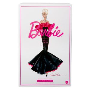 Elegance and sophistication are always in style. and this member-exclusive stunner is no exception. Celebrating the 65th anniversary of Barbie. our second Barbie Fashion Model Collection doll of 2024 is luminous wearing a black satin gown. ruffled with bright pink velvet. A matching pink taffeta petticoat. sheer black tights. and ankle strap stiletto heels enhance the silhouette. Glamorous accessories include dazzling gemstone jewelry and opera gloves.