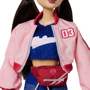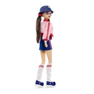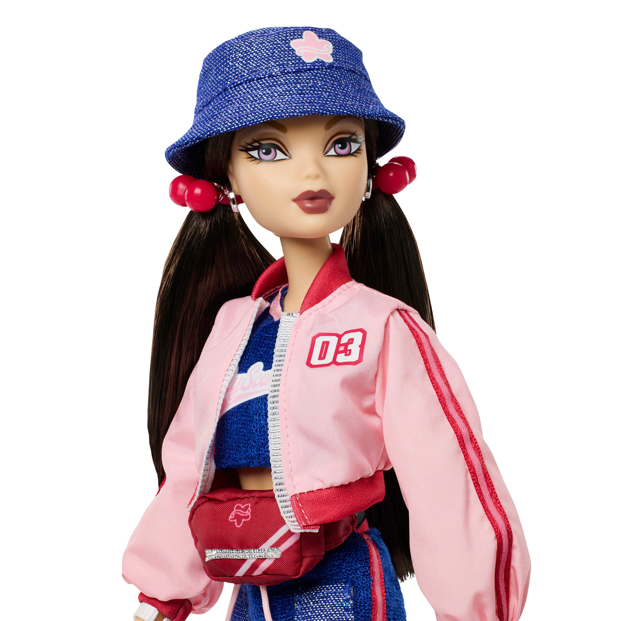 Meet the newest addition to the Y2K club! An iconic member of the My Scene girl group of the early 2000s. Nolee is back and dressed to the nines in bold colors and maximalist streetwear style. A super-fly velour-inspired skirt and top set pair perfectly with her oversized track jacket and slouchy knee-high socks. Her bucket hat. metallic jewelry. belt bag. and sleek pigtails complete the sporty-chic look. Plus. those chunky platform sneaks are perfect for a day skating through Central Park.