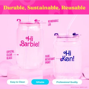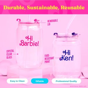 Officially Licensed Drinkware: Sip in style with officially licensed Barbie™ drinking glasses. These cute glass cups with lids and straws feature the iconic Hi Barbie! Hi Ken! scene from Barbie The Movie. A must-have glass cup set for fans