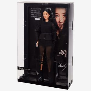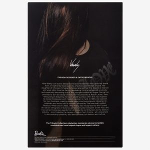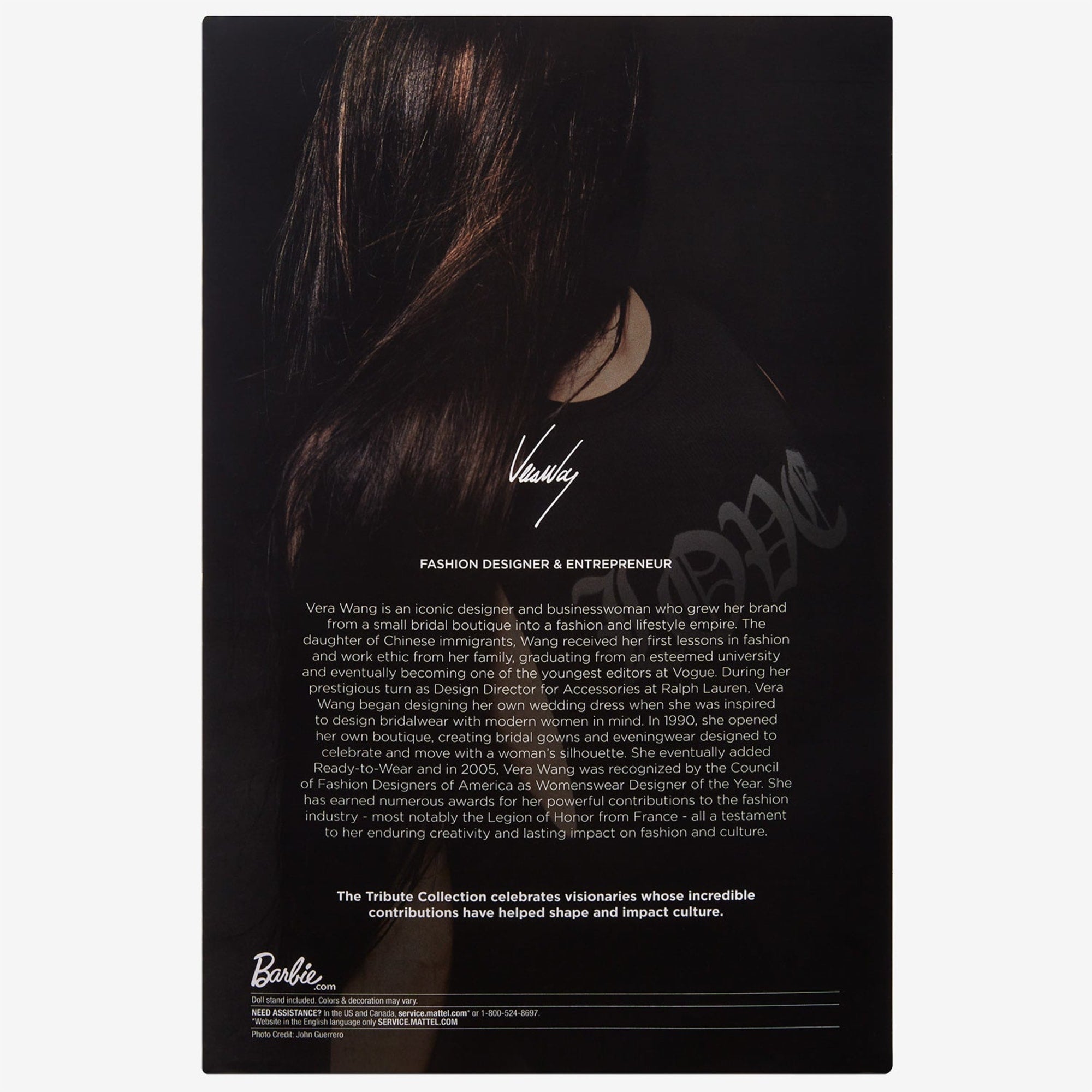 The Barbie Tribute Collection celebrates visionaries whose incredible contributions have helped shape and impact culture. Inspired by a look from her 2017 ready-to-wear collection. Vera Wang Barbie Doll wears a monochromatic ensemble featuring a black romper under a chiffon dress with attached puff sleeves. a front slit. and the word LOVE featured at the hem. A peplum belt with a zipper detail. black socks. and platform heels with sculpted buckle details complete her look.