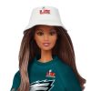 Barbie doll is celebrating Super Bowl LIX with her officially licensed Eagles team gear. She brings the excitement of their victory to life in a stylish sweatshirt decorated with their logo. paired with matching shorts and sneakers. To show even more spirit. this sporty superfan wears a bucket hat with the Super Bowl logo and waves a cheer-ful foam finger. Relive the big gameday thrills again and again with our winning keepsake.