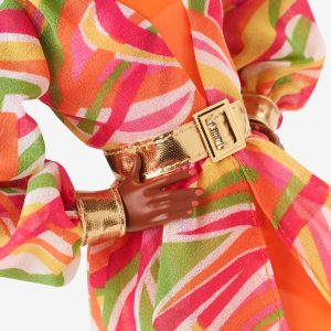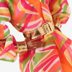 In 1968. Christie debuted and quickly became one of Barbie’s BFFs. To celebrate her 55th anniversary. we reimagined one of her beachy looks from the 1960s with modern details. Christie turns heads at a glamorous poolside soirée in a bright orange dress paired with a sheer overlay in a swirling. mod print. Strappy orange boots. golden hoops. and a C monogram necklace complement her floor-sweeping high-low look. Gorgeous curls swept back from her face showcase coral-hued makeup that nods to the original doll.