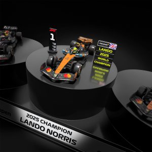 Put the peak of the paddock at the center of your collection with the Hot Wheels® 2025 Formula 1® Podium Set. Detailed Hot Wheels Premium castings of the top three finishers from the 2025 race season. driven by Lando Norris. Max Verstappen. and Oscar Piastri. are displayed on a tiered podium with parc fermé signs for each place and a pit board by the champ. Beautifully rolling bespoke Real Riders with Pirelli tyres mean you don’t have to keep these beautiful machines in park. though.