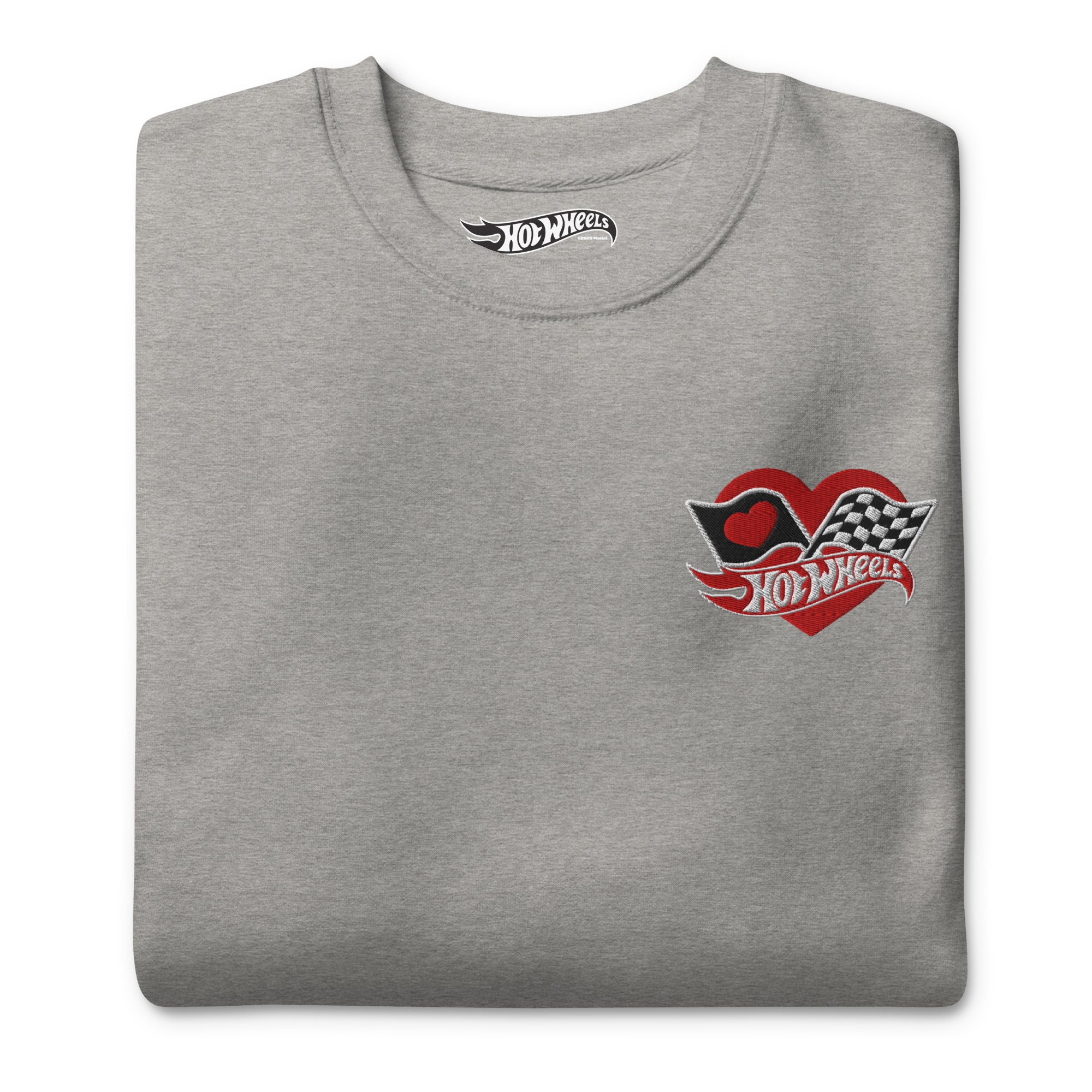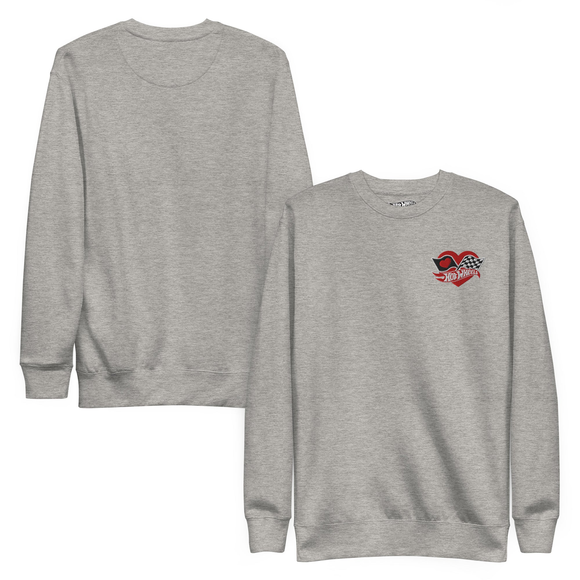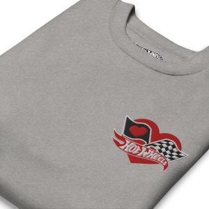 Rock our classic Hot Wheels Checkered Hearts Embroidered Gray Sweatshirt with ribbed crew neck. long sleeve cuffs. and a flat hem. Layer it up or wear it on its own for a contemporary streetwear look. With the soft fleece inside and comfortable fit. it’s sure to become your favorite everyday sweater right away! This exclusive Hot Wheels design is only available through Mattel Creations.