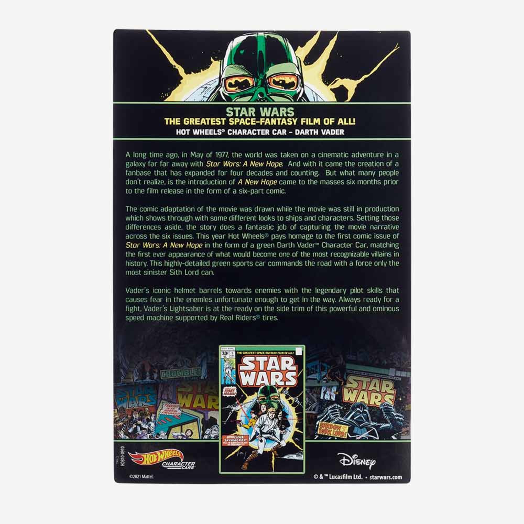Star Wars™ fans will want to collect this Hot Wheels® Star Wars™ Green Darth Vader™ Character Car — or turn green with envy! Based on the original iconic Star Wars #1 comic book cover that features the super villain in a green hue. this unique vehicle is an instant collectible! The color. design and stylized deco are inspired by the green armor appearance of Darth Vader on the vintage comic’s cover illustration and will delight Star Wars™ fans of all ages. Special packaging that further highlights the comic book cover and arrives in a shipper box. Colors and decorations may vary.