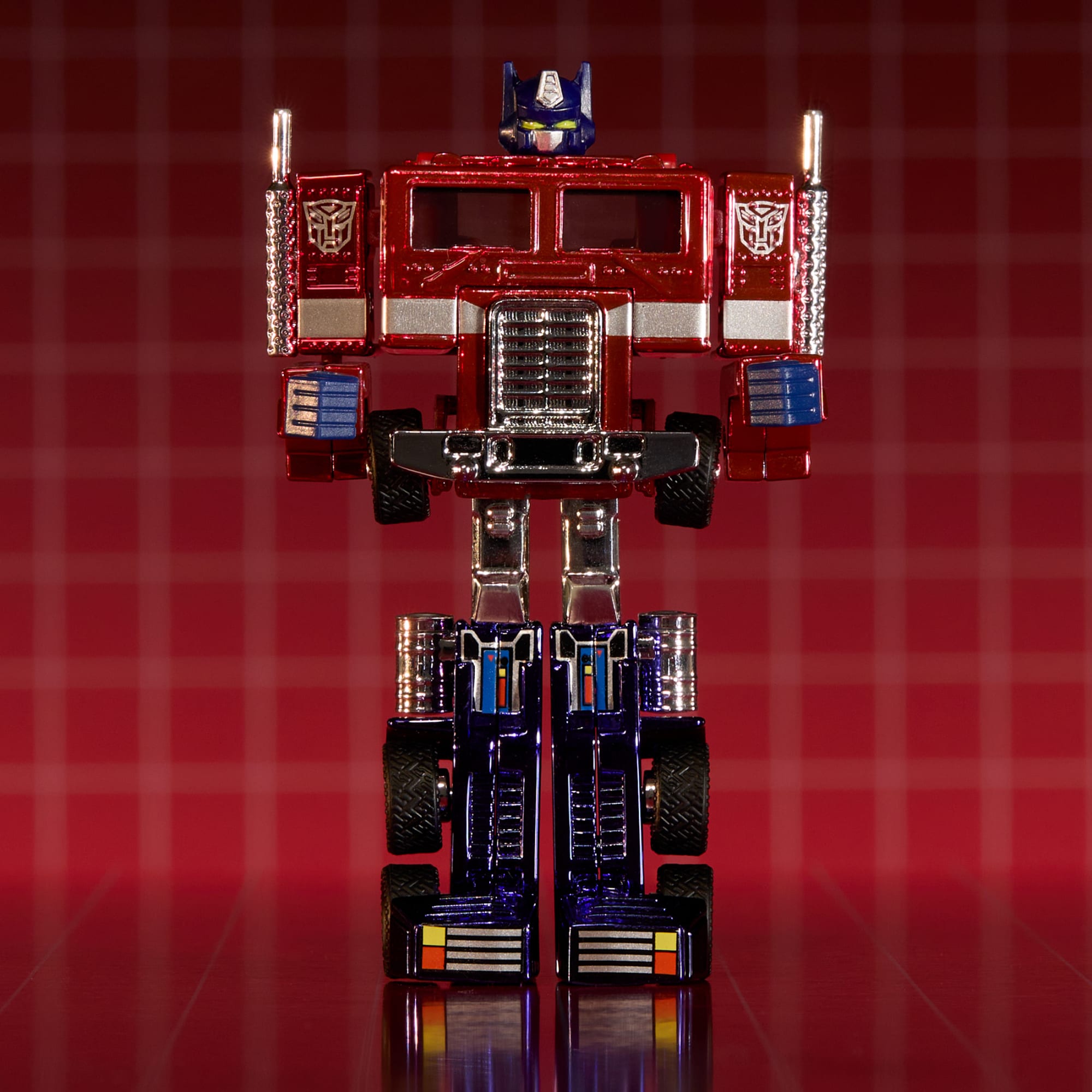 Two of the biggest fandoms have come together for the first time with the Hot Wheels Transformers Optimus Prime. Modeled after his first appearance in Generation 1. this die-cast version of the Autobot leader can convert from a heavy-duty truck cab into a towering robot. ready to battle the Decepticons. We even designed the packaging so you could display it in either vehicle or robot mode.