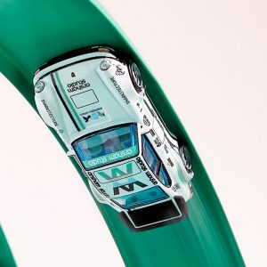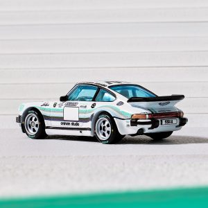 In his second collab with Porsche. Daniel Arsham rebuilt a 1986 Porsche 930 (the turbocharged version of the Porsche 911) and gave it a livery inspired by a 1980 entrant at the 24 Hours of Le Mans. For part 3 of his collaboration with Mattel Creations. Arsham adapted that design. using a similar color scheme and swapping the previous corporate logos for Arsham-specific ones. Look closely. and you’ll spot a 3020 Rallye Monte-Carlo badge. too – setting this car up for a time-bending future discovery.