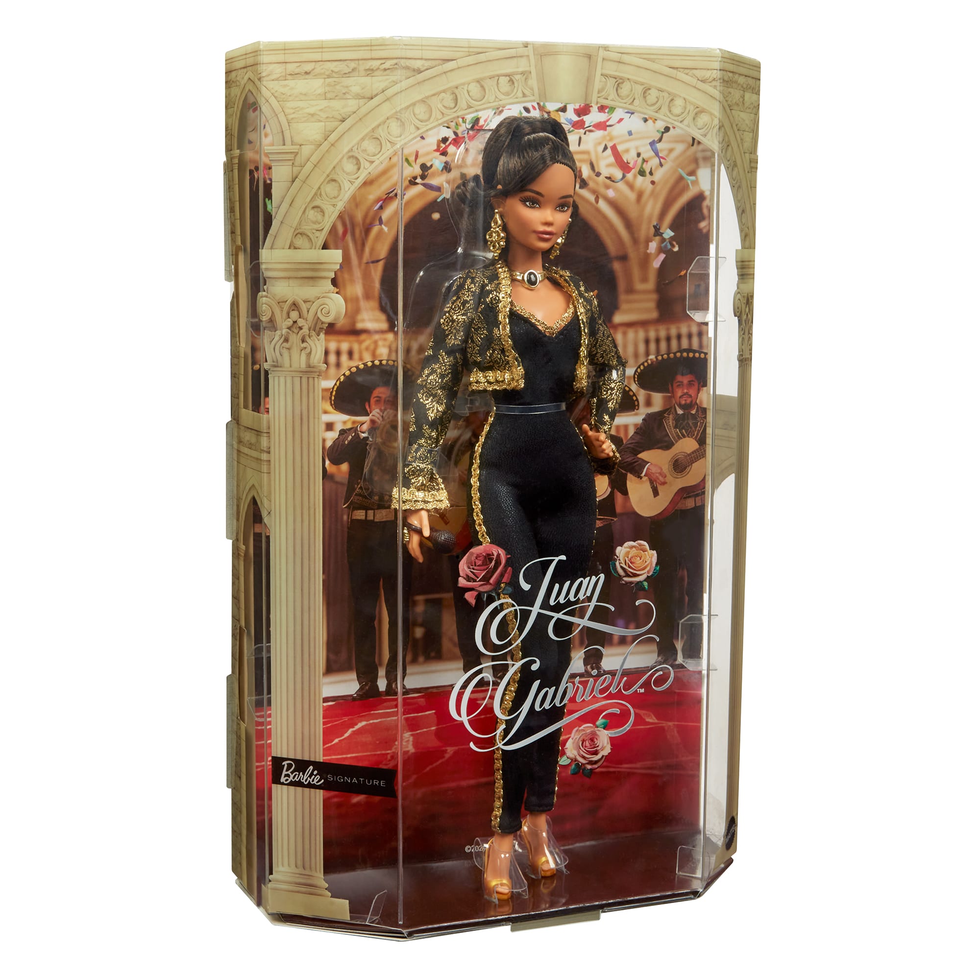 Our latest doll in the Barbie Signature Music Series celebrates the Mexican artist Juan Gabriel. In homage to this beloved singer and his charismatic style. Barbie doll wears a dazzling bolero jacket inspired by what he wore at his iconic 1990 concert in El Palacio de Bellas Artes. Golden trim takes its cue from the colorful mariachi outfits often worn on stage by Juanga. the affectionate nickname give to this best-selling songwriter and pop star by his fans.