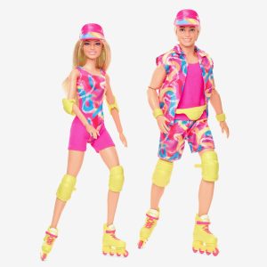 This collectible Ken doll is a skating machine in a retro-inspired outfit. He wears a hot pink tee and colorful matching accessory set complete with a visor. knee pads. and neon Impala inline skates. Inspired by Ken’s character in the feature film. he’s ready to roll alongside Barbie for a fun day in the sunshine.