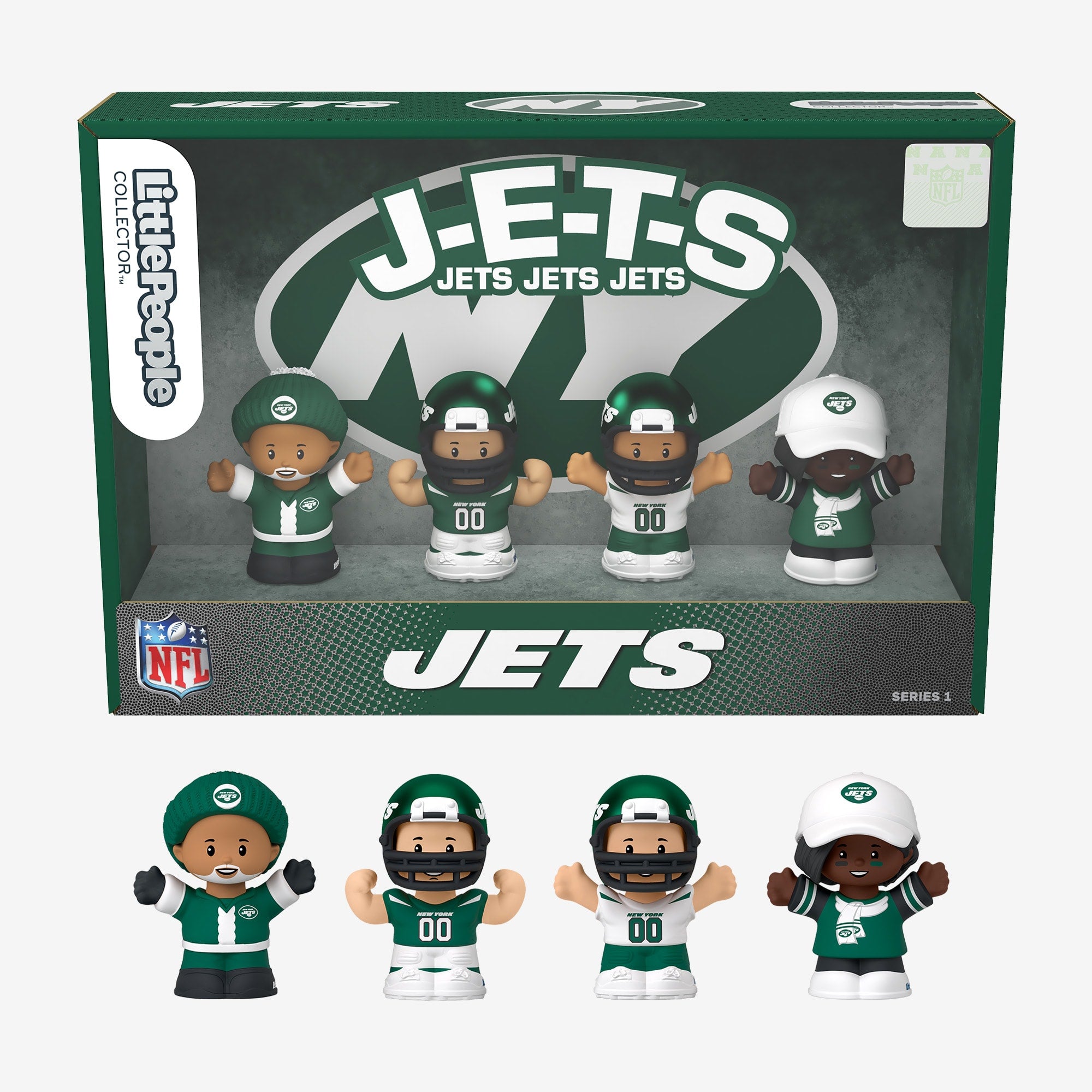 It’s football season! There’s no better way to support your team than with the new lineup of Little People Collector NFL sets! Cheer on the Jets with figures of two players and two super fans in special themed packaging. This officially licensed NFL & NFLPA product is the perfect set for NFL fans.