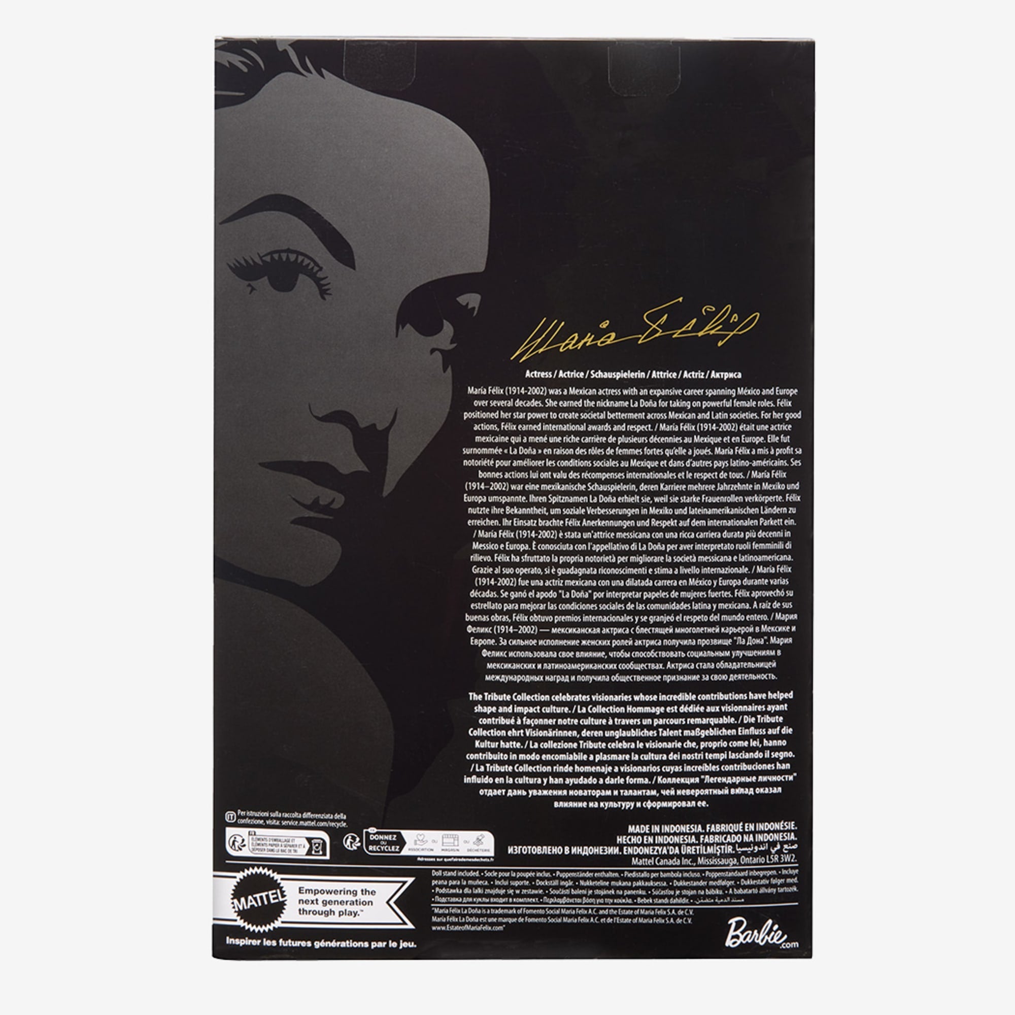 An incomparable beauty with ambition. intelligence. drive. and a social conscience. María Félix was a Méxican movie star whose performances in international films captivated audiences across the world. She used her fame and influence to advocate for positive change across Méxican and Latin societies. Barbie honors this cultural icon with a doll that glimmers in an elegant gold and black gown and shines with ornate oversized jewelry.
