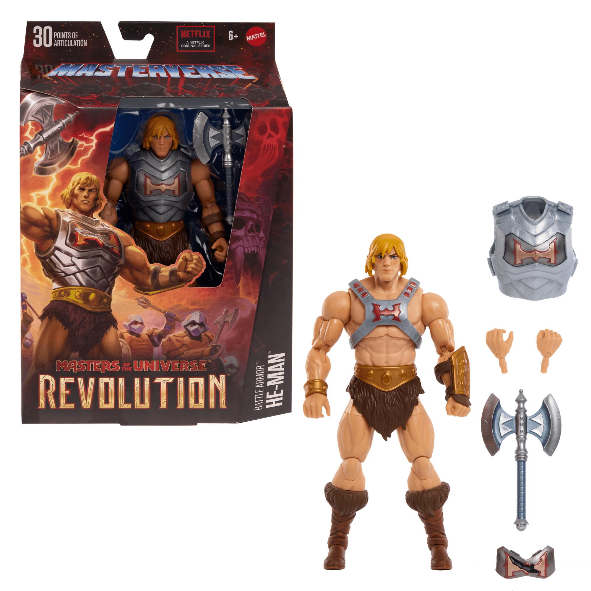 - This Masterverse deluxe action figure of He-Man is designed at 7-inch tall scale with battle armor details authentic to Masters of the Universe: Revolution. He-Man is looking fierce and battle-ready!