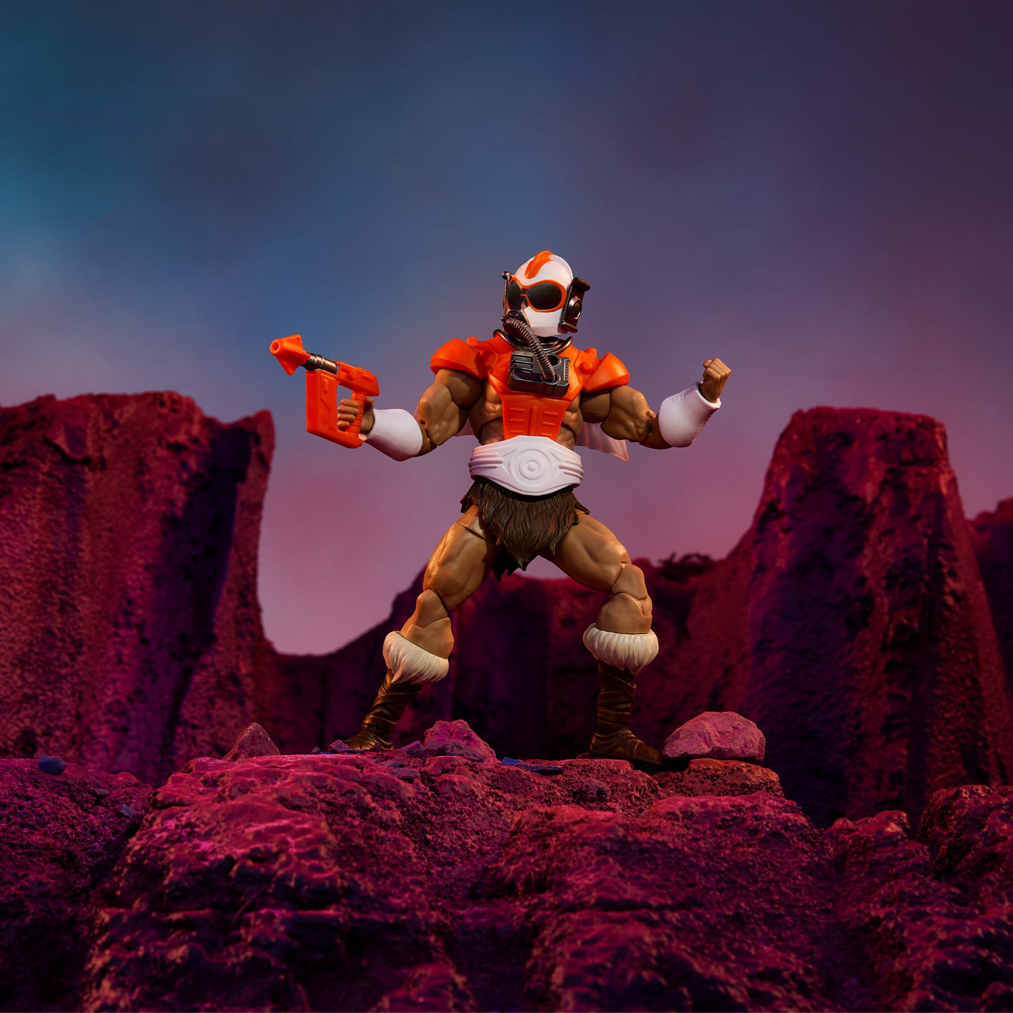 From Eternia’s past comes a legendary champion from the gladiator arena – Vykron. He took on all challenges. no matter the foe or terrain. After each victory. Vykron would claim the armor and weapons of his opponents. He would then take the time to master each weapon and their battle techniques. becoming a one-man arsenal in the ring.