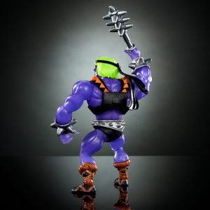 - He-Man is armed with a multi-pronged club accessory and his chest harness can be removed. His Turtles-style headscarf accents his strangely-colored mutated skin and hair.