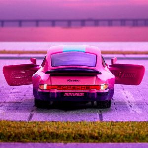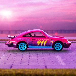 This exclusive edition features opening doors. shocking pink and turquoise colors. ’80s graphics. and premium wheels. Keeping up with the decade of excess. we even parked it in an oversized acrylic case with a bodacious background.