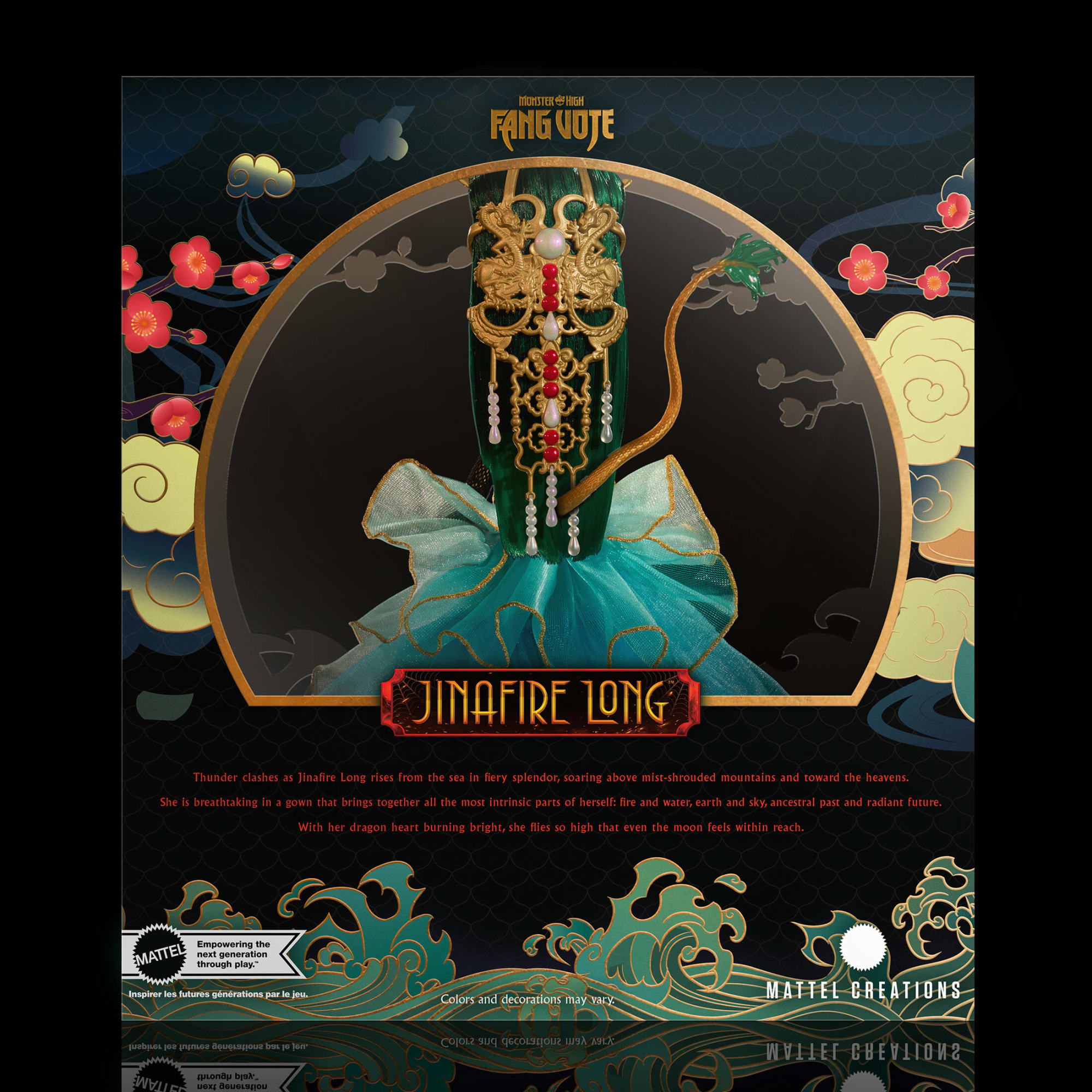 Fang Club members helped design this doll for all Monster High fans! You’d except some serious drip from a Fanghai fashion designer. and Jinafire Long doll brings it just in time for the Year of the Dragon. She appears as if she’s rising from the water in this absolutely ghoul-amorous gown inspired by her unique scaritage. Members submitted thousands of votes for her hairstyle. makeup. jewelry. nails. purse. shoes. and doll stand. The final creation is one you’ll crave for your collection.