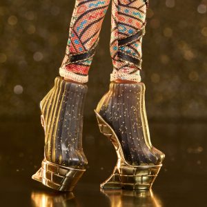 Her golden bodysuit features her signature mummy wrap print with white glitter ribbons that twist around her body. The traditional Anubis mask adds an air of ghoul-amorous mystery while showcasing her style.