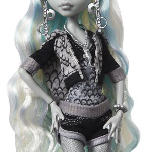 At Monster High it’s time for Frights. Camera. Drama! An ode to classic black and white horror films. the Reel Drama collection gives the original Monster High cast a dramatic and cinematic twist. Lagoona Blue remains the fintastic star she always has been. accompanied by her pet piranha Neptuna figure and two eye-catching graphic movie posters — one mini. and one life-size! With head-turning packaging perfect for this chilling capsule collection. Lagoona Blue doll never looked so gore-geous. Fully articulated. Doll cannot stand alone. Colors and decorations may vary.
