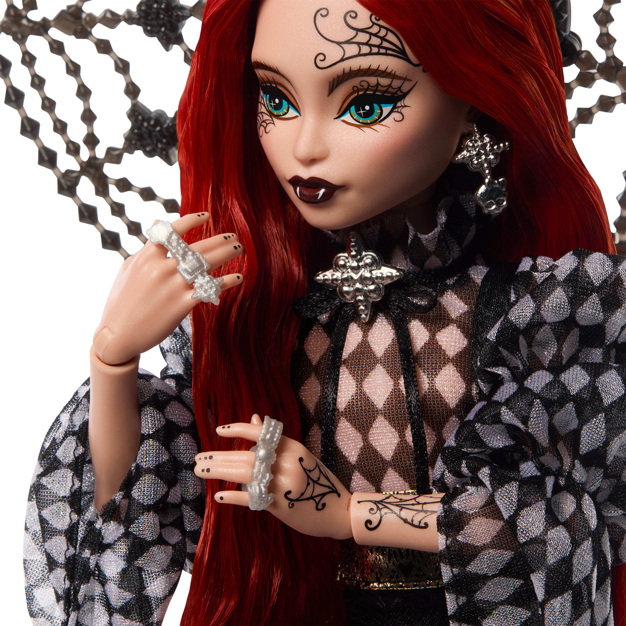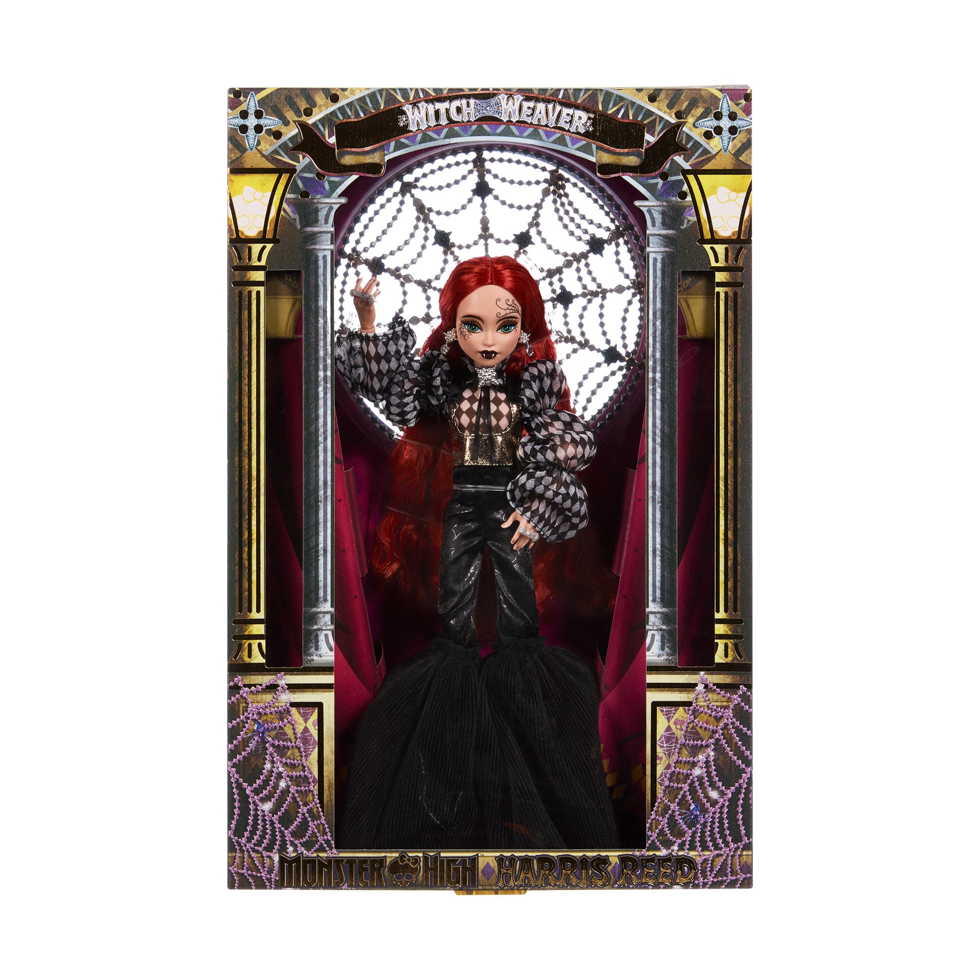 Monster High has partnered with visionary fashion designer Harris Reed for a darkly glamorous doll that exudes spellbinding style — the Witch Weaver. Wearing a crystal spiderweb hat inspired by Reed’s signature headpieces. the Witch Weaver conjures sartorial magic with a sheer harlequin blouse and midnight-black bell bottoms. Able to weave benevolent spells. this enchanting witch empowers every monster to express their true self — in whatever form that may be.