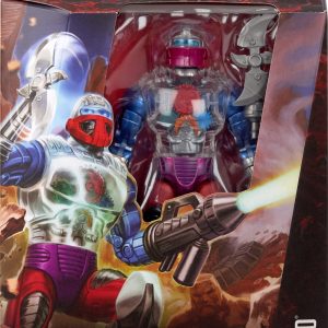 Skeletor stole away with Man-At-Arms’ latest creation. Roboto. Using his diabolical havoc magic. Skeletor reprograms the artificial intelligence to do his evil bidding. This New Eternia figure of the robot warrior includes his signature clear torso and helmet showing his internal robotics. A dial on his back activates the robotics! His gloved forearm can be swapped with 3 arm attachments – a blaster. a claw. and spinning bladed weapon.