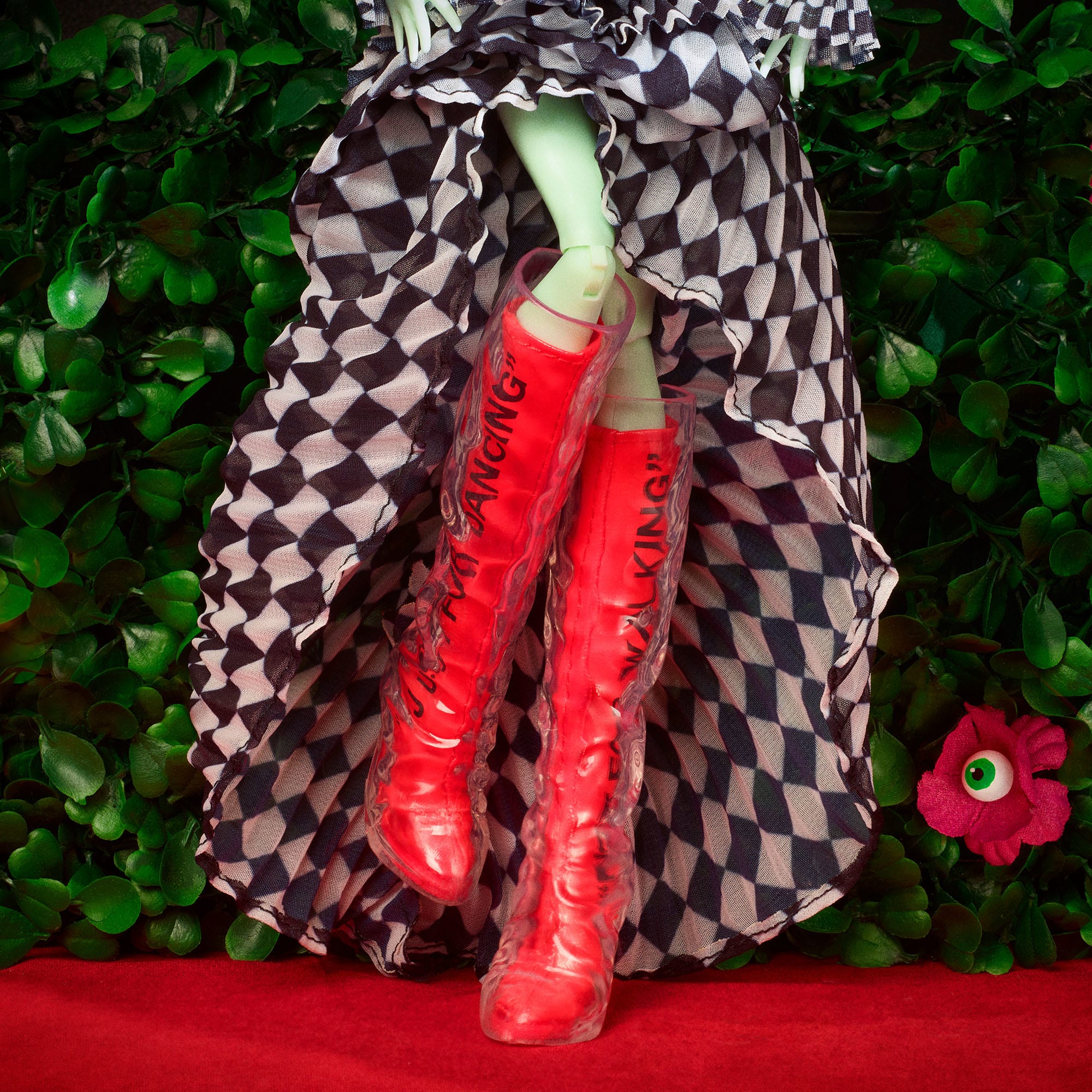 Our second doll sporting Off-White™ fashion is Harmonie Ghoul. A vision on any dance floor. this Fashion-Monster is wearing a look from a 2017 Off-White™ collection. Her cascading dress and knee-length boots deliver the drama with every step.