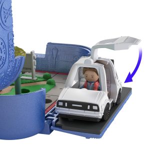 Time travel goes tiny with this iconic Polly Pocket x Back to the Future collaboration. The compact exterior features an electric image of the Time Machine next to Marty and Doc Brown. Open to reveal iconic movie locations and three dolls (Marty McFly. Doc Brown. and Lorraine McFly) who can peg into various locations. including the dance floor. the roof. and Marty’s hoverboard. Reenact movie moments like lightning striking the clock tower or Marty’s performance at the dance.