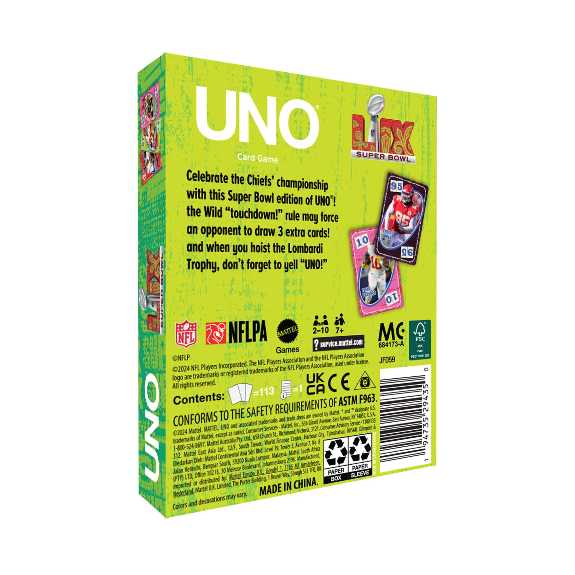 Show your team spirit during game nights with our UNO Fandom Super Bowl LIX deck. which celebrates the Chiefs’ championship season. These premium-quality cards showcase your favorite players and include a collectible foil card. There’s even a Super Bowl Wild Touchdown Rule to kick off more football-inspired fun.