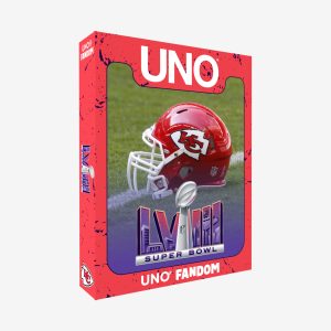 UNO LVIII Super Bowl brings fans together with a deck inspired by the NFL. Players still try to match colors and numbers. and when someone plays the special wild Touchdown card. the last player to raise their hands to signal a touchdown must draw 3 cards! And when down to their last card. players don’t do an end zone dance. they yell UNO!