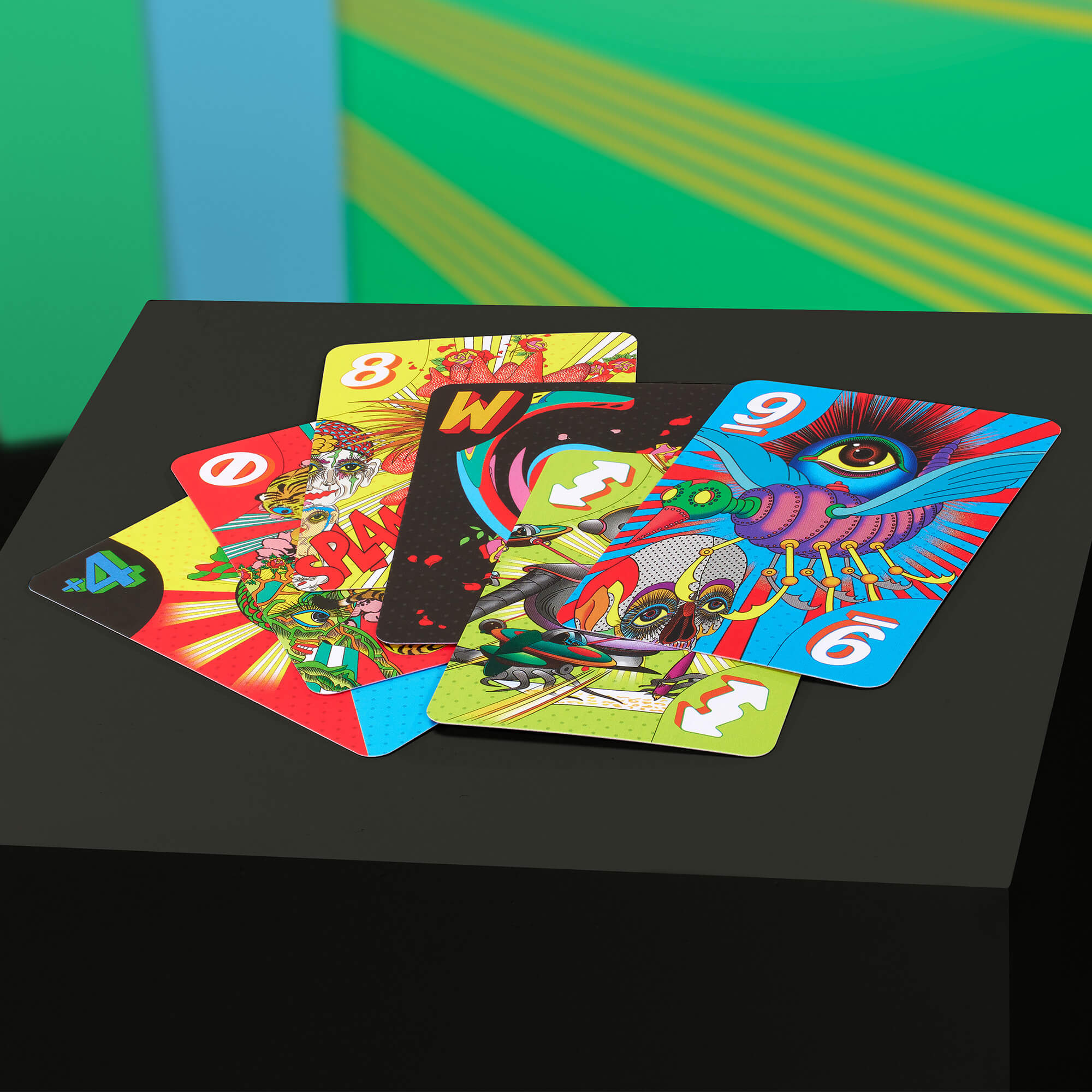 Our UNO deck features 112 cards. with uniquely different maximalist designs by Tanaami on each colorway. Wild. and Draw Four cards. This surreal deck brings the Japanese Pop Art legend’s playable art to the masses and makes every game a kaleidoscope of color.