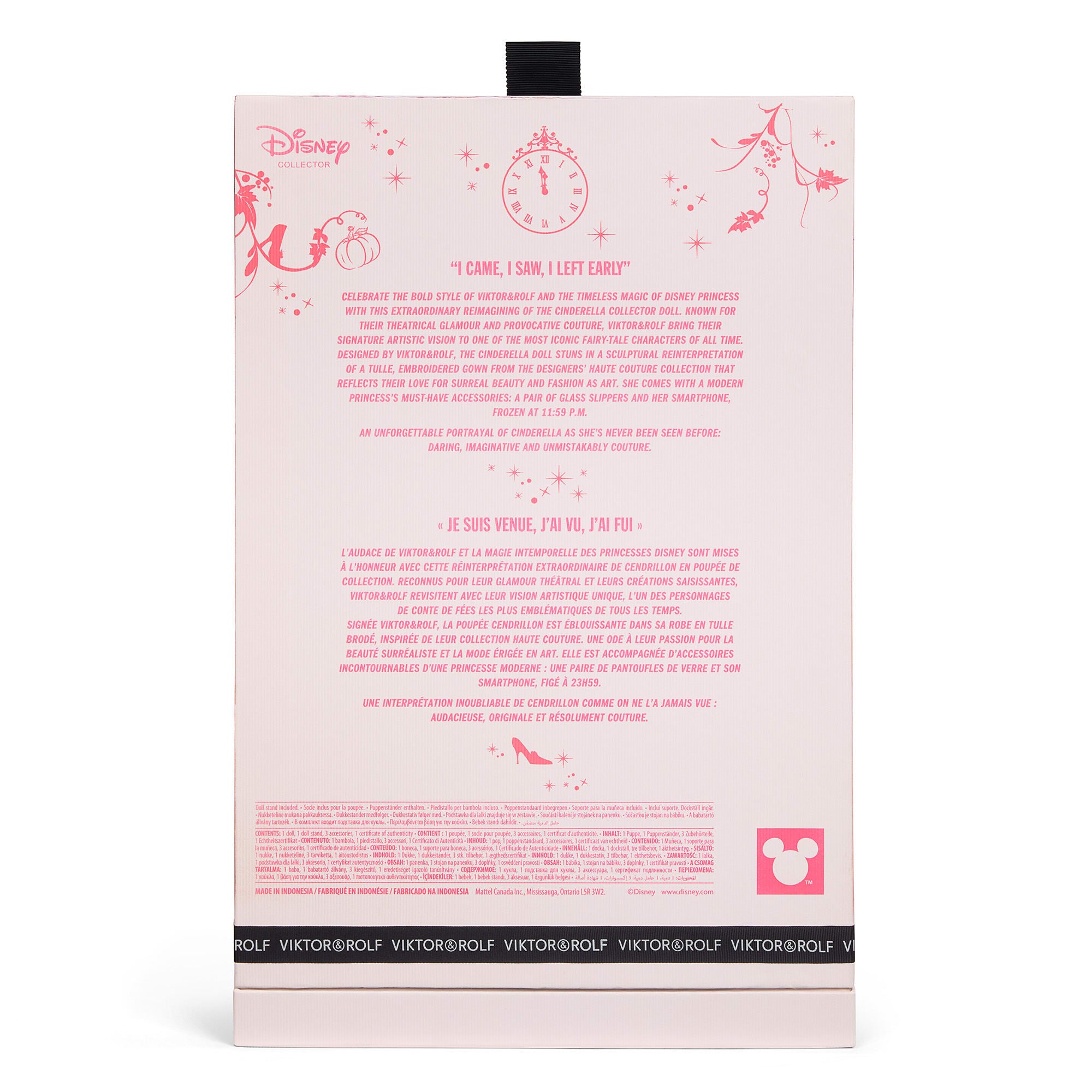 Relive the magic of a classic fairytale with this inventive reimagining. In a dream collaboration between Disney and avant-garde fashion house Viktor&Rolf. a timeless Disney Princess receives a modern couture makeover. Inspired by Viktor&Rolf’s Haute Couture Spring/Summer 2019 Fashion Statements collection. this Cinderella doll’s look merges the iconic elegance of her original gown with a fresh. contemporary silhouette and a playful. on-brand statement. Dressed in layers of mesh tulle. and a taffeta under-dress. the look is completed with sparkling slippers. a smartphone frozen at 11:59pm. and a black ribbon choker. This Disney Princess doll is runway ready for a royal ball.