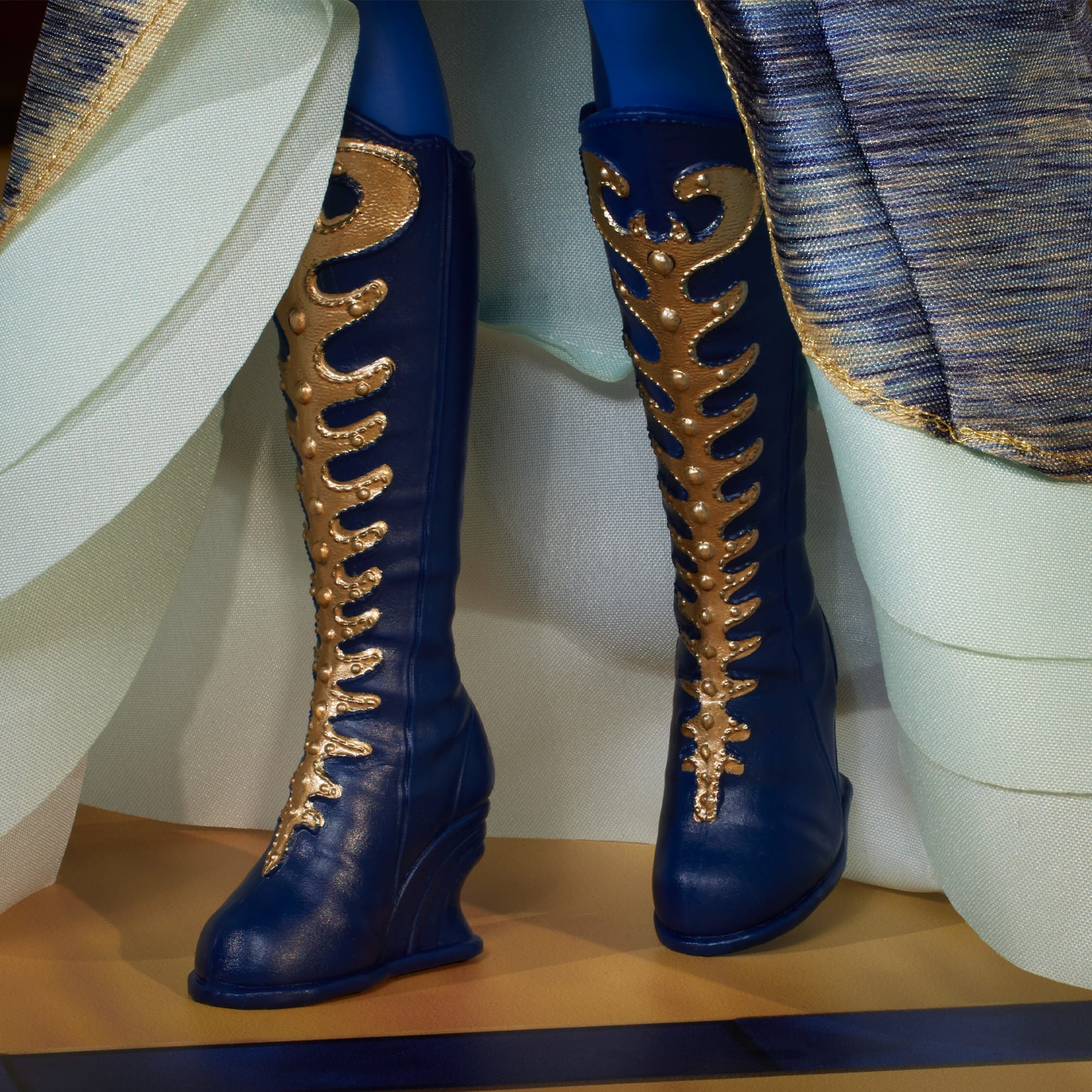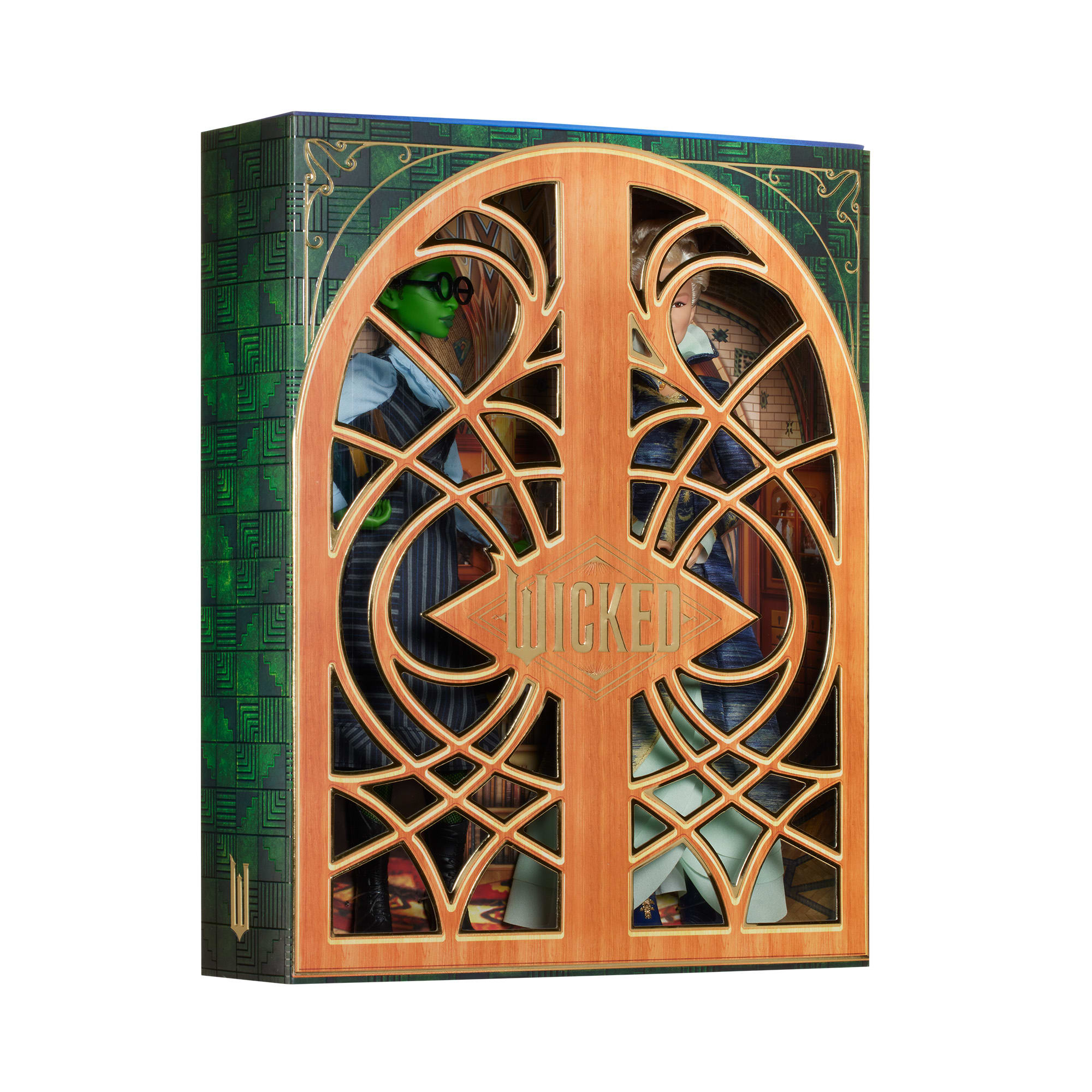 Inspired by Universal Pictures’ Wicked. our exclusive 2-pack captures the iconic tutoring scene at Shiz University. where Elphaba develops her natural talents with help from her new mentor Madame Morrible. Elphaba is dressed for school in a blue blouse and grey pinstriped dress. while Madame Morrible wears a night sky-inspired robe. featuring a popped collar and puffed shoulders. This magical set will cast a spell on collectors and Ozians alike.